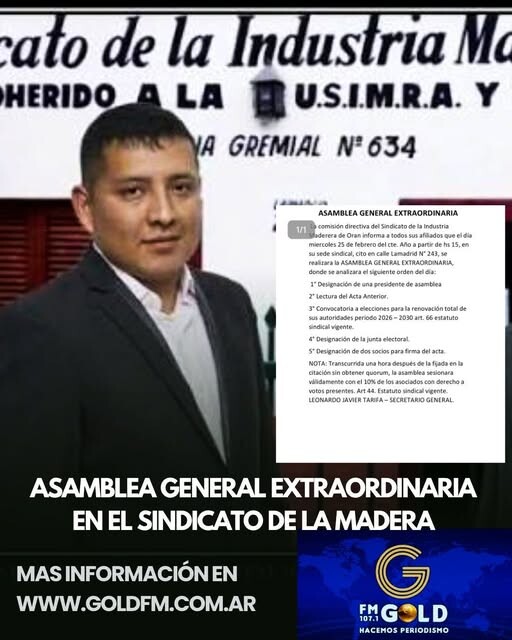 La Comisión Directiva del Sindicato de la Industria Maderera de Orán informa a todos sus afiliados que el miércoles 25 de febrero del corriente año, a partir de las 15:00 horas, se llevará a cabo la Asamblea General Extraordinaria en la sede sindical, ubicada en calle Lamadrid N° 243, ciudad de San Ramón de la Nueva Orán.