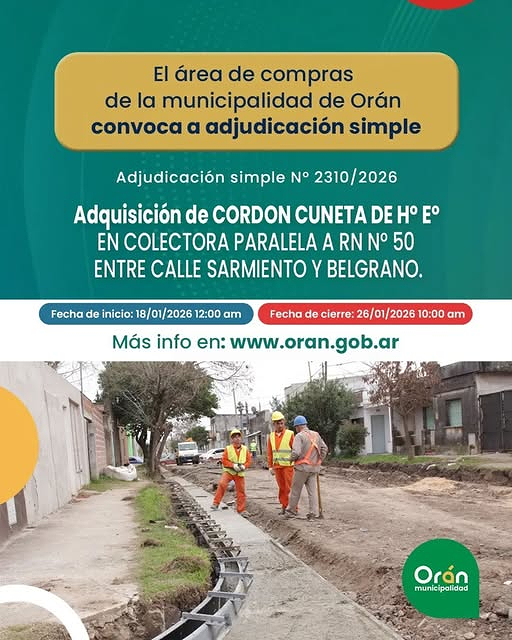 La Municipalidad de Orán llama a Convocatoria de Adjudicación Simple Nº 2310/2026 para la ejecución de cordón cuneta de hormigón en la colectora paralela a la Ruta Nacional Nº 50, en el tramo comprendido entre calle Sarmiento y Belgrano.