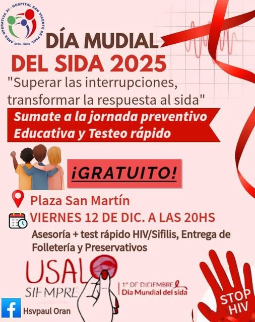 LOCALESSALUD E INVESTIGACIÓN EL HOSPITAL SAN VICENTE DE PAÚL INFORMA UN COMUNICADO IMPORTANTE : REPROGRAMACIÓN DE LA JORNADA POR EL DÍA MUNDIAL DE RESPUESTA AL VIH/SIDA 4 diciembre, 2025 0 5 Debido a las condiciones climáticas, se suspende la jornada por el Día Mundial de Respuesta al VIH/SIDA prevista para hoy a las 20 hs. La actividad se reprograma para el viernes 12 de diciembre, a la misma hora y en el mismo lugar.