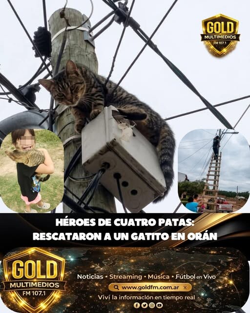 Al arribar al lugar, detectaron que un pequeño felino se encontraba atrapado en la parte superior de un poste de aproximadamente 7 metros de altura, sin posibilidad de descender por sus propios medios.
